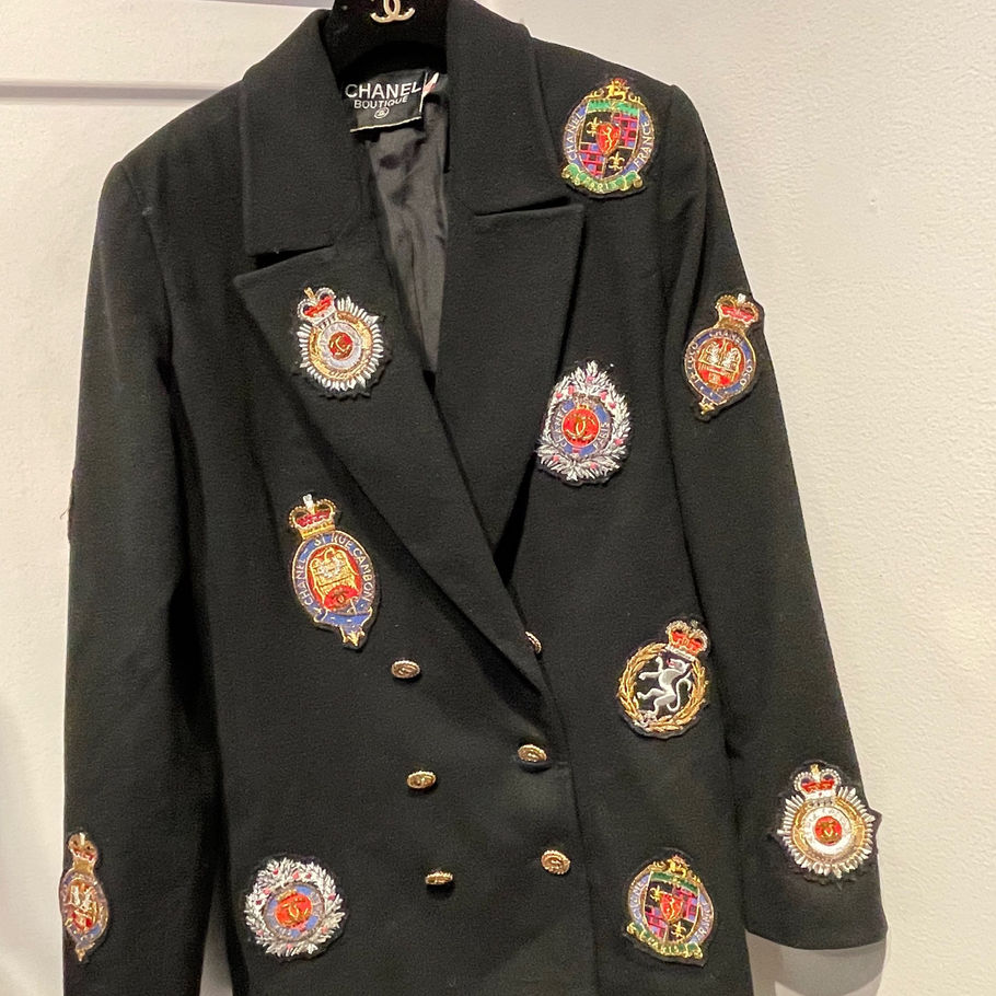 Boutique labelled, size 42, double-breasted with gilt CC buttons, the black wool ground appliquéd to the front with military-style embroidered badges incorporating CC monograms, Chanel Rue Cambon address, padded shoulders